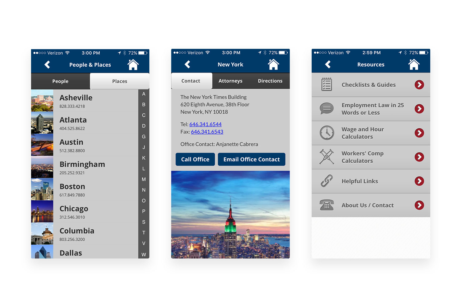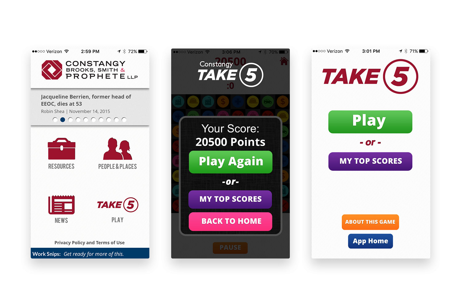 With offices all over the US and a large base of clients, Constangy needed a mobile app to engage and interact with their clients. Working in close collaboration with their marketing team, we designed and built an iOS and Android app with a litany of helpful features. Highlights of the app include industry news, legal definitions, calculators, office and staff directory, and other resources. To top it off, we even included a legal-themed game to give users a fun reason to open and interact with the app.