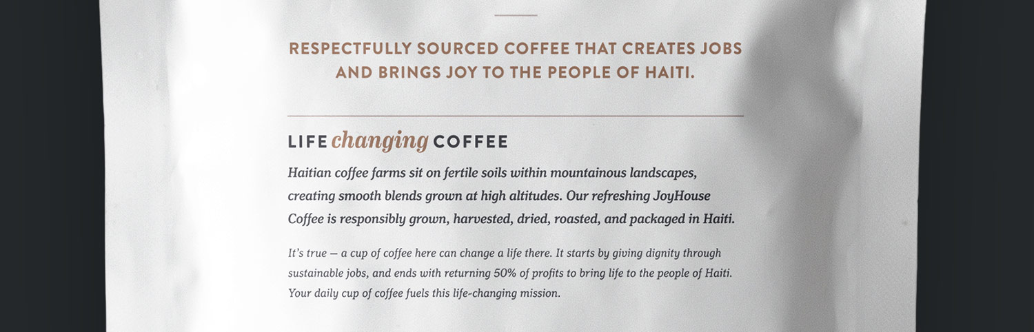 How do we succinctly communicate the most important pieces of this remarkable story? Most coffee companies have good coffee, but few fuel life-changing work among the poorest of the poor. This is the distinction that we believe will create a connection with customers and eventually loyal advocates for the brand. Beginning with the tagline “Rise Up. Choose Joy.”, we crafted a messaging hierarchy that intentionally unfolds the story of both the mission and the product.